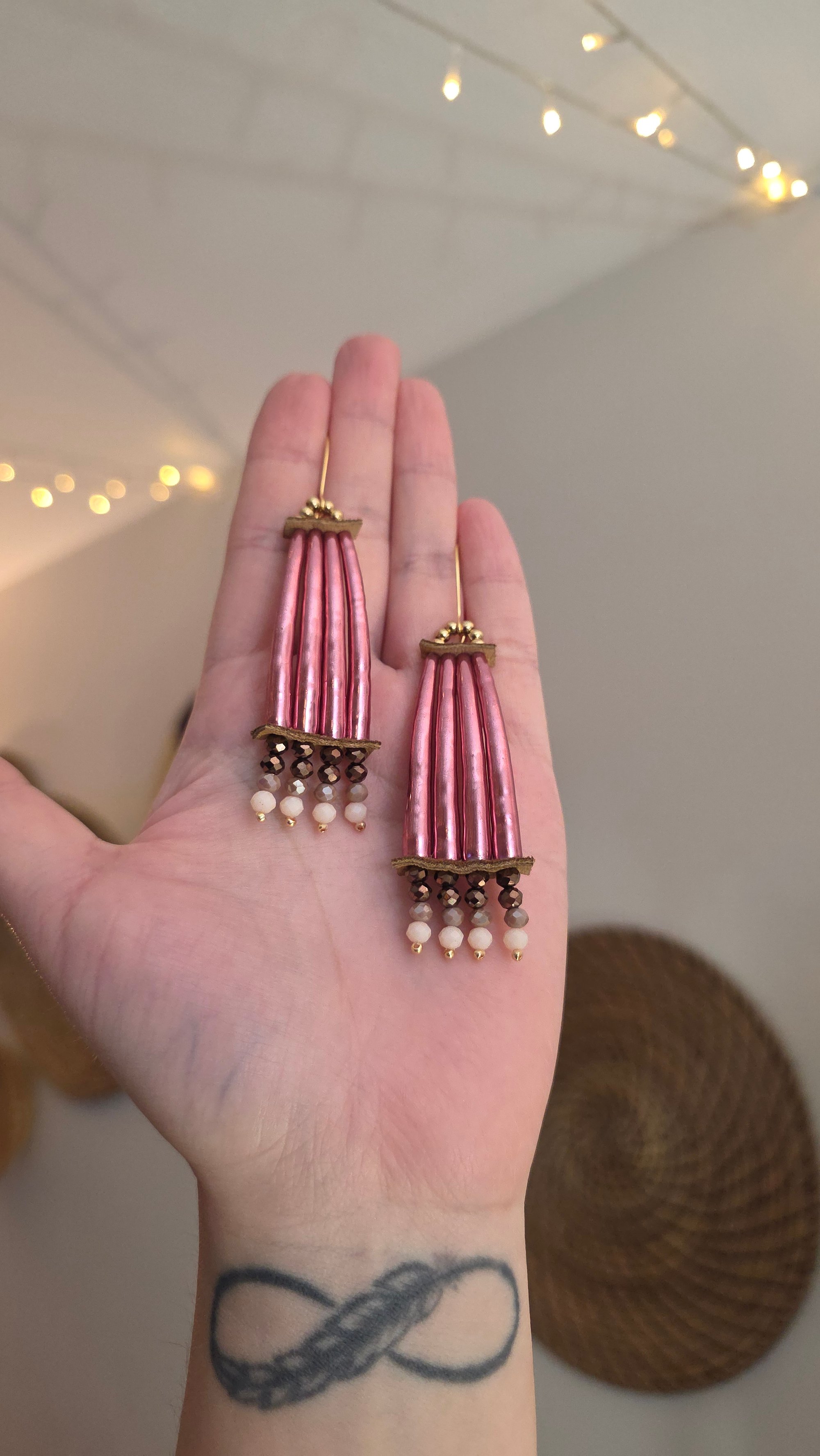 Made with dentalium shells, rondelle beads, deer leather on 24k gold plated hooks.