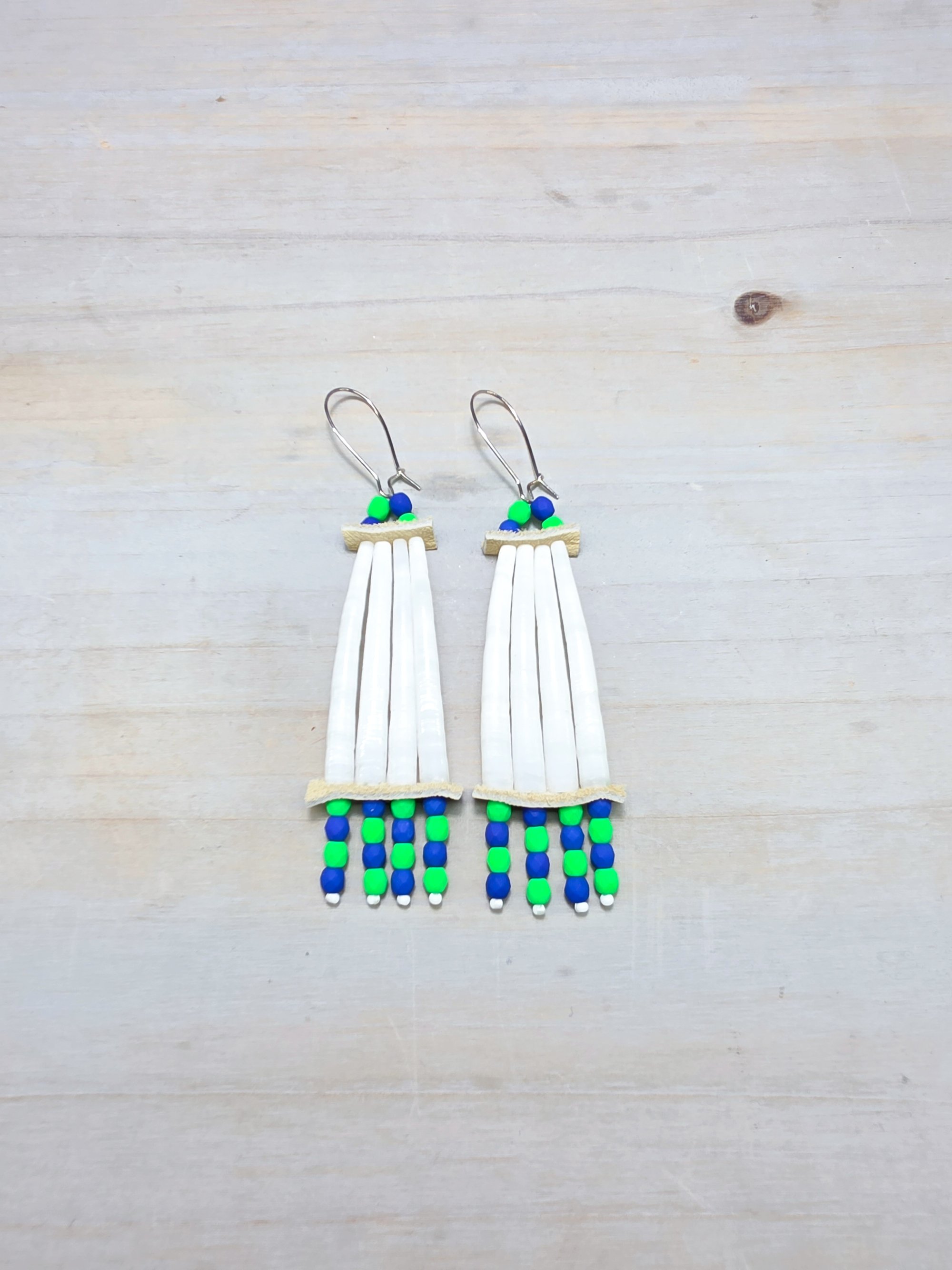Materials: Smooth dentalium shells Deer leather Sinew Czech faceted fire polished beads On sterling silver kidney hooks