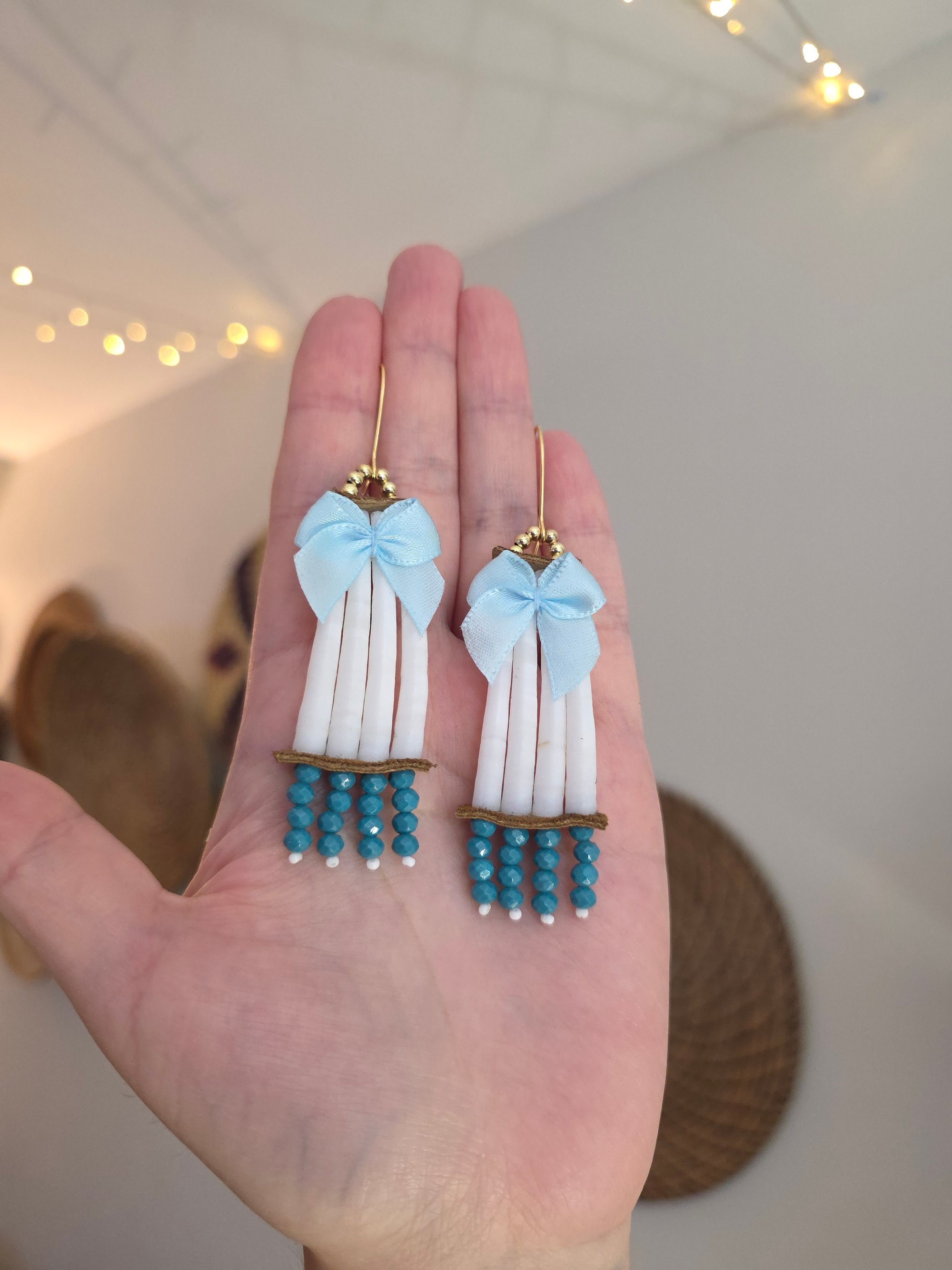Made with dentalium shells, deer leather, faceted roudelle glass beads on 14k gold hooks.